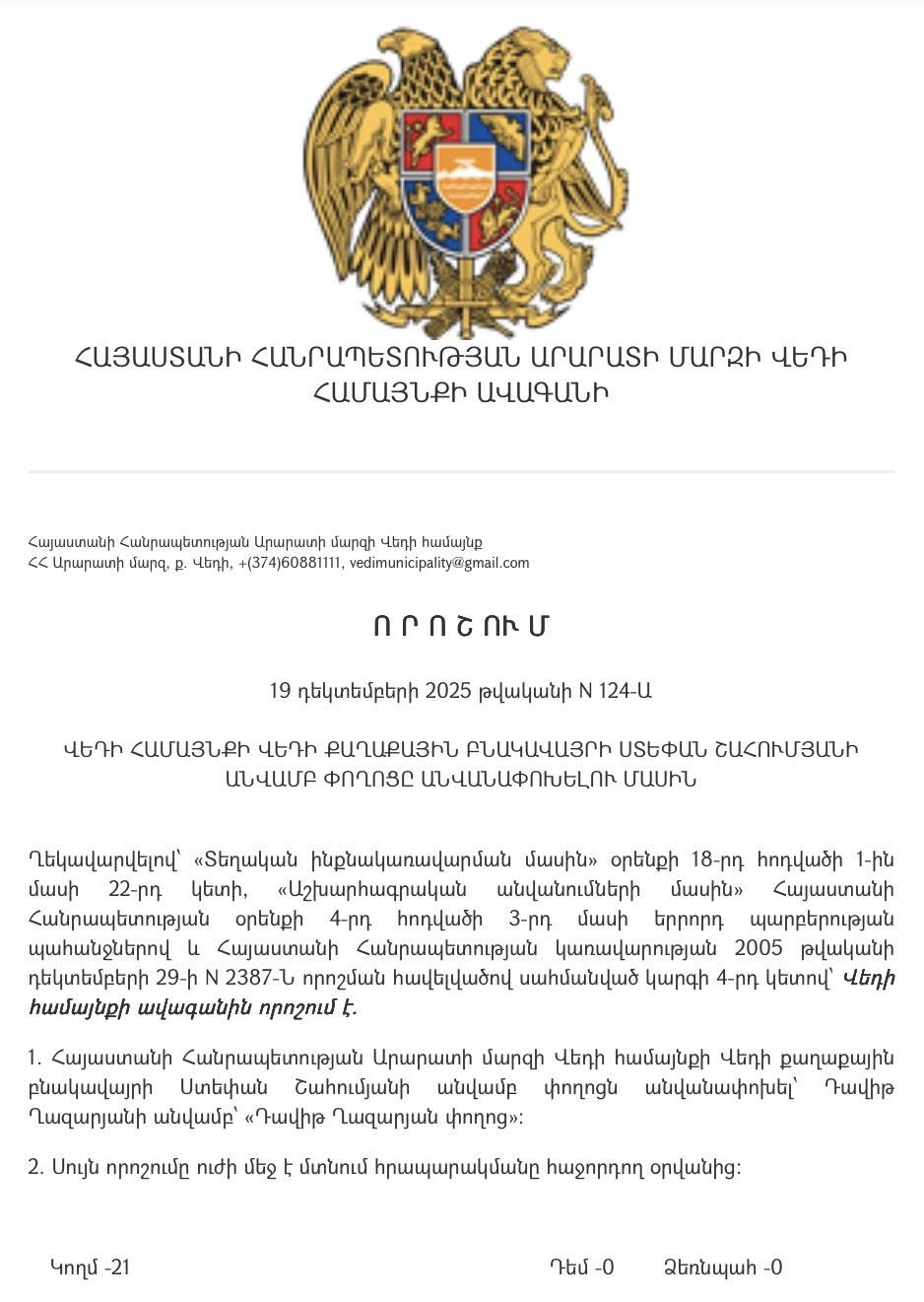 Վեդի համայնքի ավագանին միաձայն կողմ քվեարկեց Վեդի քաղաքային բնակավայրի Ստեփան Շահումյանի անվամբ փողոցն անվանափոխել՝ Դավիթ Ղազարյանի անվամբ՝ «Դավիթ Ղազարյան փողոց»: