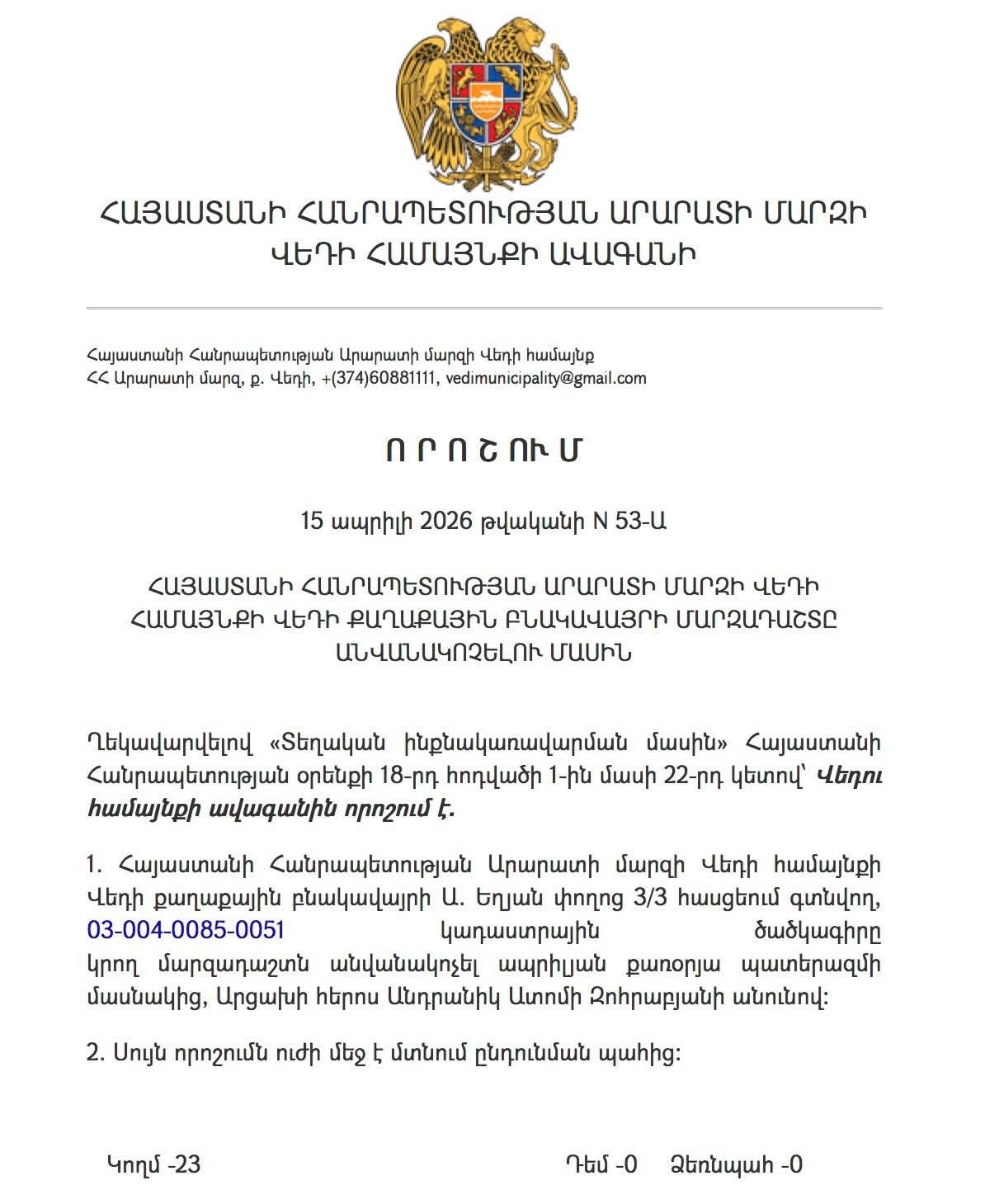 Վեդու համայնքապետարանը տեղեկացնում է, որ Վեդի համայնքի ավագանին միաձայն կողմ քվեարկեց եւ որոշում կայացրեց Վեդի քաղաքային բնակավայրի մարզադաշտը անվանակոչել ապրիլյան քառօրյա պատերազմի մասնակից, «Ոսկե Արծիվ» եւ «Մարտական Խաչ» 1-ին աստիճանի շքանշանակիր, Արցախի հերոս Անդրանիկ Ատոմի Զոհրաբյանի անունով։