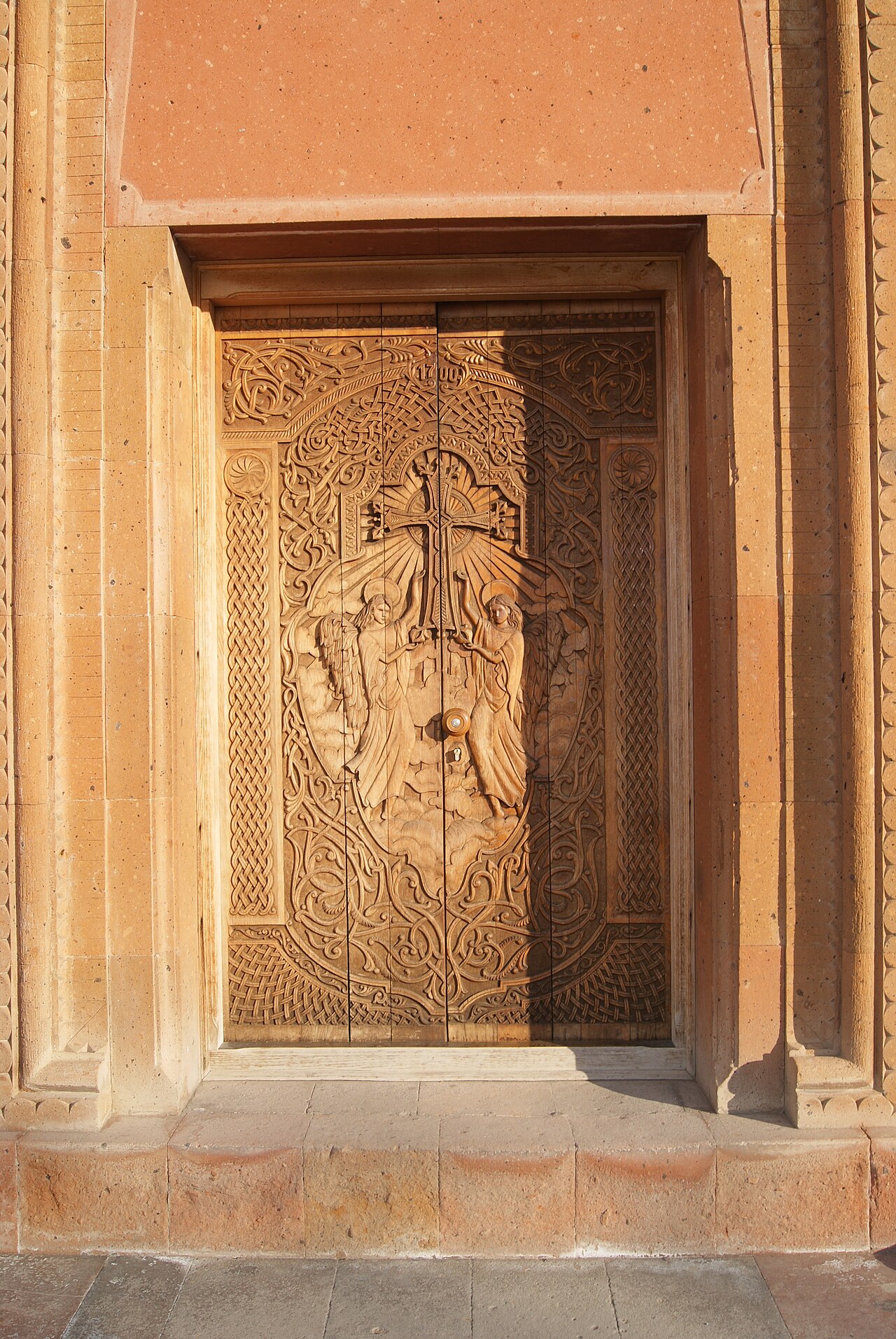 Եկեղեցու մուտքը զարդարում է հայկական փայտարվեստի նրբագեղ նմուշ հանդիսացող երկփեղկ դուռը, որի կենտրոնում պատկերված է հաղթական խաչը՝ շրջապատված երկու հրեշտակների բարձրաքանդակներով և բարդ հյուսկեն նախշերով։